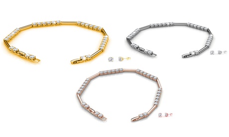 Groupon ofrece esta pulsera y pendientes modelo Tenis vendido por Discount Wholesale and Distribution LTD Material: base de latón de 18 quilates de oro chapado en plata circonita conjunto Pulsera: 19 cm de largo Pendientes: 3 mm Peso: 17 g Tipo de cierre: de botón
